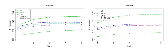 为了作比较,CH-PerMLP 和 CM55-PerMLP使用低级别的特征,我们使用Tagrec framework去学习MP和MP-u,使用Mulan llibrary去学习CH-BPMLL 和 CM55-BPMLL。