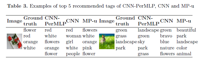 表3显示,我们的模型与MP-u相比,既可以预测个性化标签又可以预测内容标签,MP-u纯粹预测个性化标签和CNN推荐的内容标签。结果,CNN-PerMLP推荐了和图片相关的标签。例如,在第一幅图片上,推荐器会推进个性化标签,例如“flowers”,“ flower”,“ orange”,内容标签如“white”或“red”。