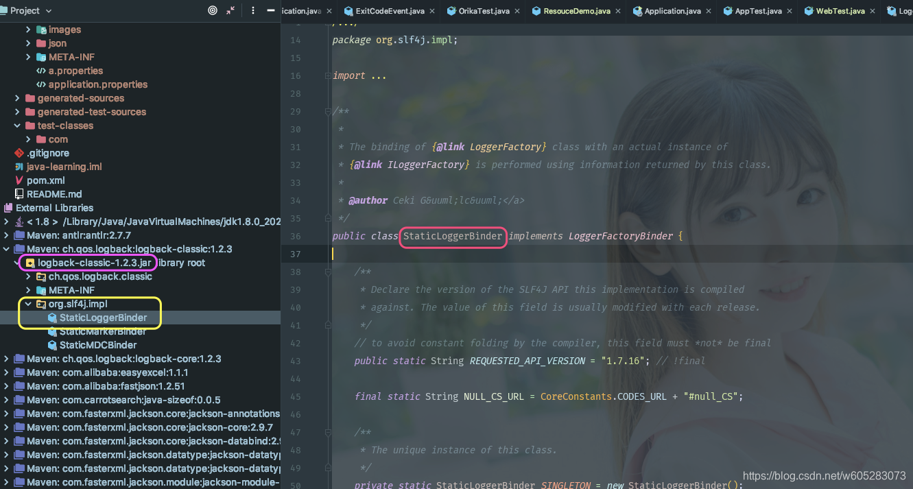 我们跟进去,发现这个类包名为org.slf4j.impl,但是在logback包里!!!!!!!!