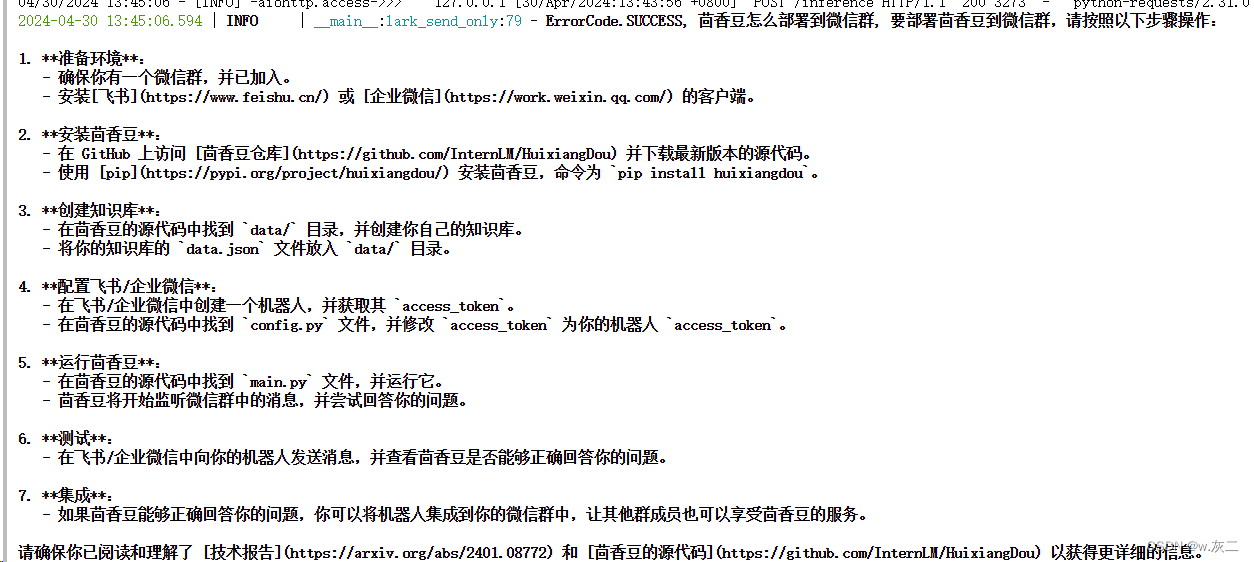 # 填入问题 sed -i '74s/.*/ queries = ["huixiangdou 是什么?", "茴香豆怎么部署到微信群", "今天天气怎么样?"]/' /root/huixiangdou/huixiangdou/main.py # 运行茴香豆 cd /root/huixiangdou/ python3 -m huixiangdou.main --standalone