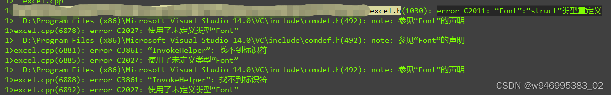 vs2015编译vc6项目时,error C2011: “Font”:“struct”类型重定义 相关解决办法 最近在升级一个历史遗留项目软件时,使用到了excel.cpp,在vc6下编译时没有问题的;在改了N多vs2015认为是错误的语法之后,编译到了excel,然后就出现了如截图中所示的问题;1、“Font”:"struct"类型重定义2、未申明的标识符“_Application”: 未声明的标识符“app”: 未声明的标识符“Workbooks”: 未声明的标识符等一系列的未申明的标识符问题从网上查找到的解决办法如下,好几篇都是一样的,按照图中的方法操作以后,还是不...