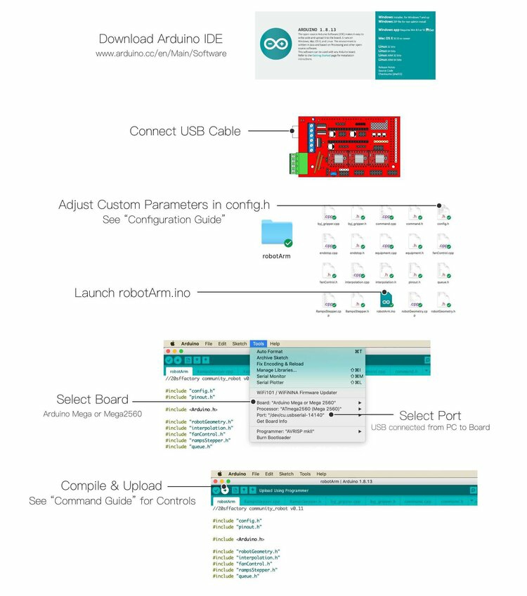 资料里包含机械臂step模型文件,stl 3D打印文件,组装说明,物料清单,各版本固件源码,上位机,命令发送上位机,电路组装图,固件调试指南,G代码转换软件以及使用说明。