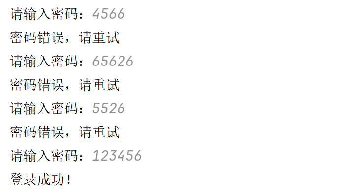 代码解释:不知道用户需要输入几次才对,用while循环持续询问,直到输入正确密码才跳出。