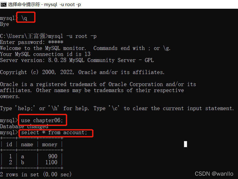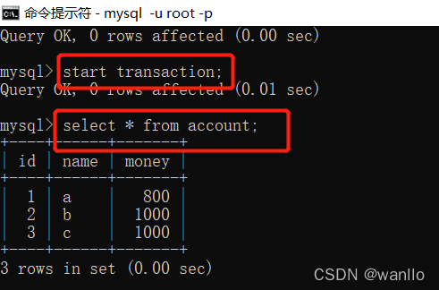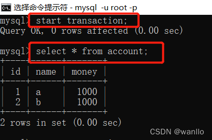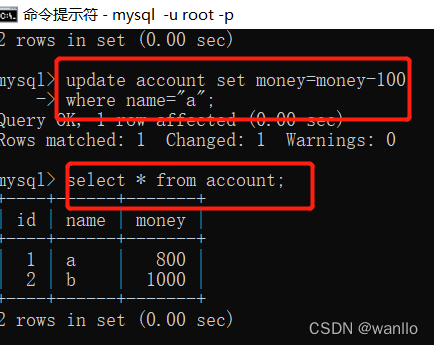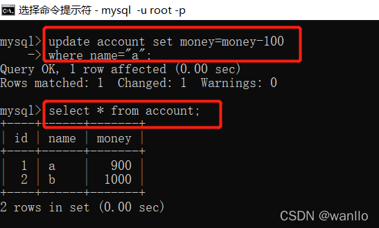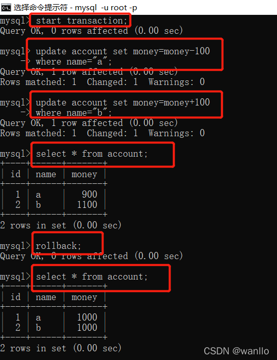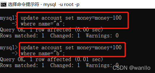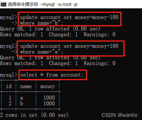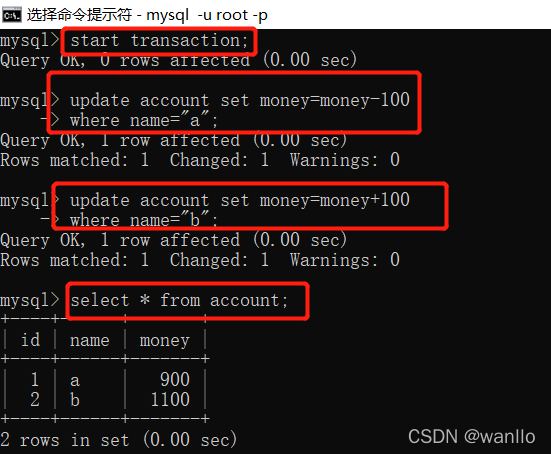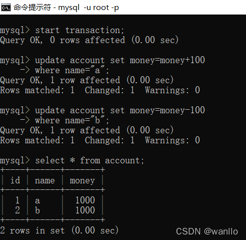 开启一个事务,通过update语句将b账户的100元转到a账户