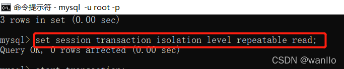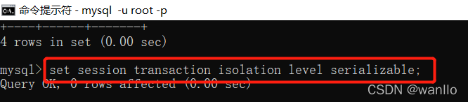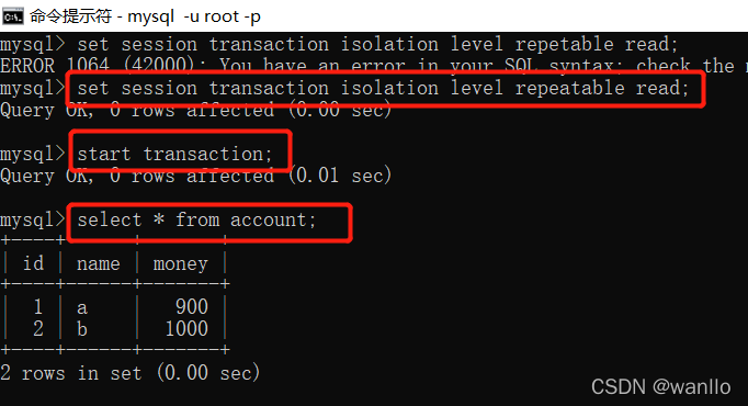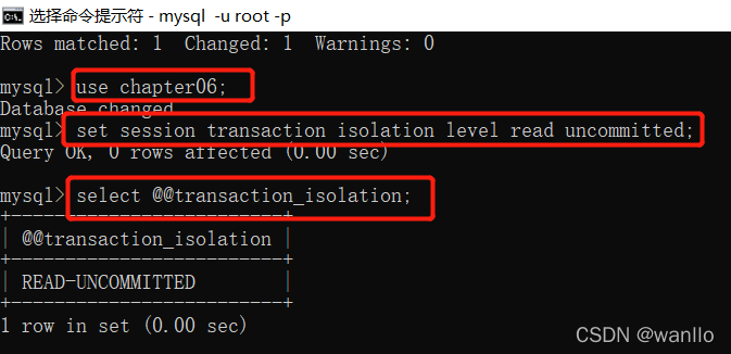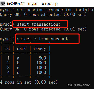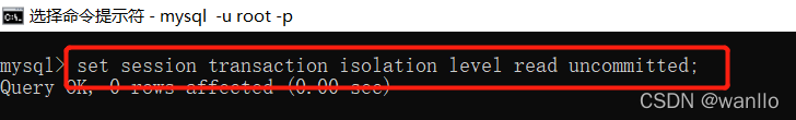将b账户中是事务的隔离级别设置为read uncommitted,使用select语句查询事务的隔离级别;