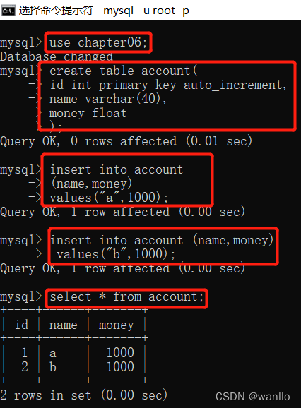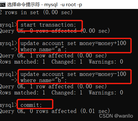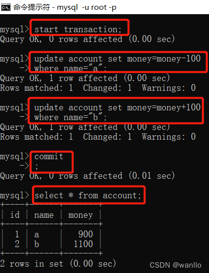 首先开启一个事务,通过update语句将a账户的100元转到b账户,最后提交事务;