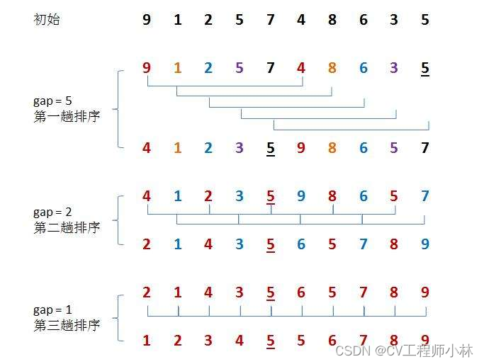 间隔为gap的分为一组,然后堆每组数据进行插入排序。对于a[]={9,1,2,5,7,4,8,6,3,5},假设gap==3(一般来说,gap的值也是分组的组数),则9、5、8、5为第一组,1、7、6为第二组,2、4、3为第三组。对每组数据分别进行插入排序,则第一组结果为5、5、8、9,第二组为1、6、7,第三组为2、3、4此时,a[]={5,1,2,5,6,3,8,7,4,9}。