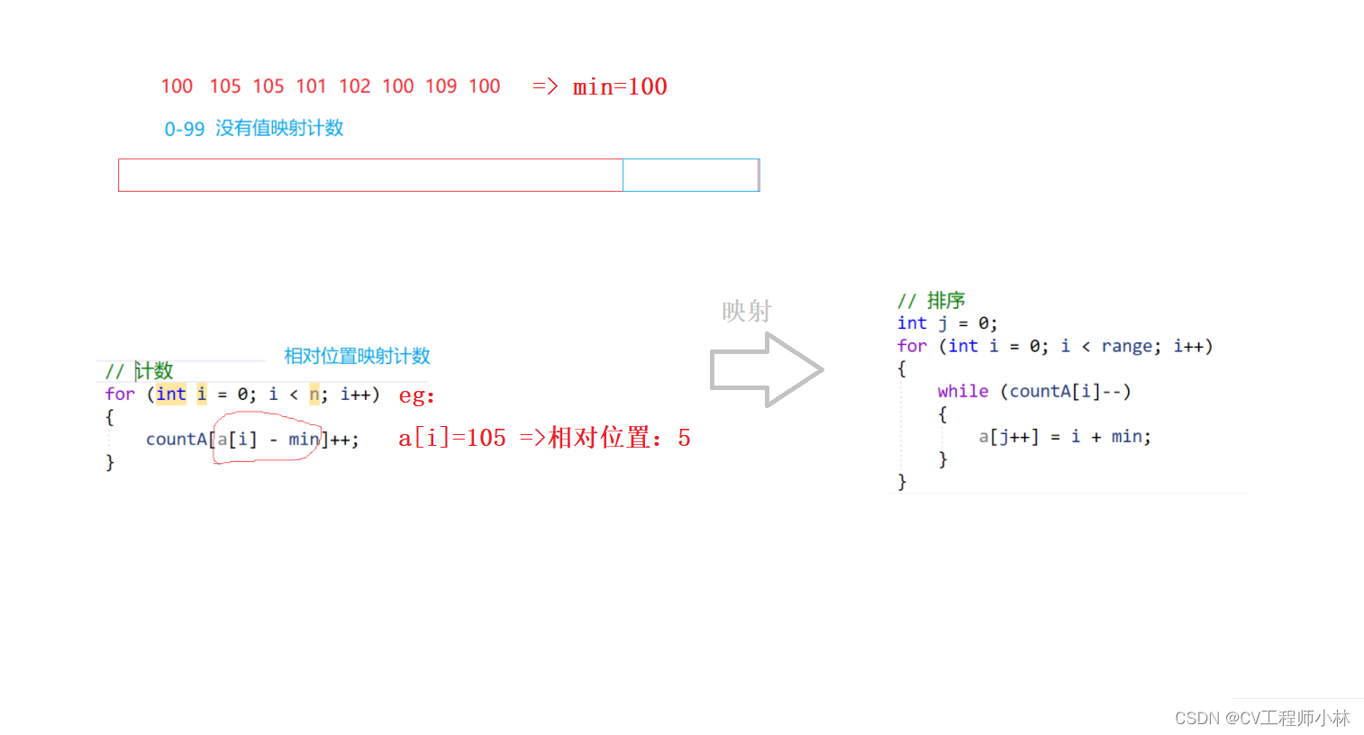 countA[a[i] - min]++; //通过相对位置映射计数(这是一种哈希的思想)