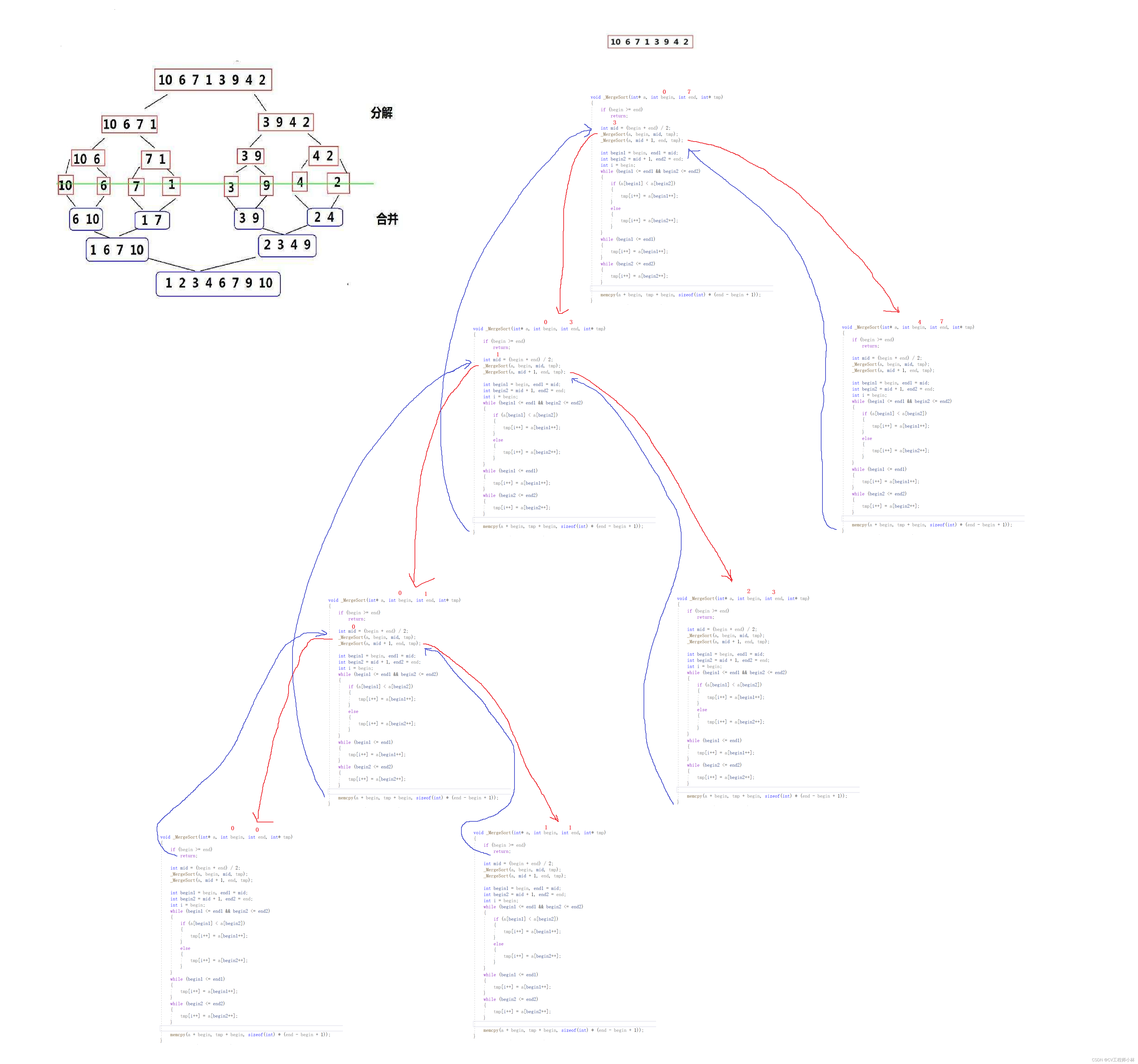 3.end1、begin2没有越界,end2越界了怎么办? - 修正end2到n-1内,然后继续归并