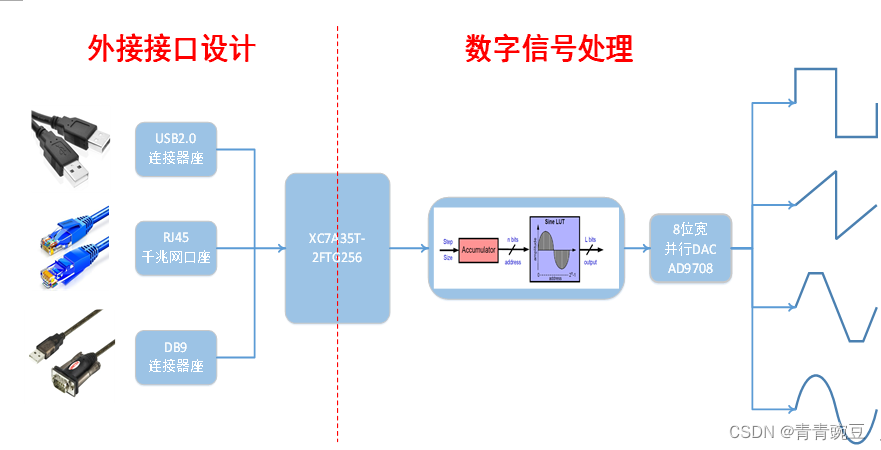 图2 USB2.0/RS232/LAN控制并行DAC输出任意频率正弦波、梯形波、三角波、方波整体设计示意图