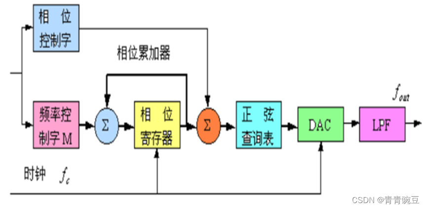 如图5所示是数字变频的内部结构示意图,大家可以清楚地看到当外部给定了“频率控制字”、“相位控制字”和外部时钟fclk后,FPGA即开始以fclk为时钟参考,每个时钟周期进行“频率控制字”的累加,其结果会加上“相位控制字”一起送至任意波的查找表,FPGA再把查找表中对应到数值送到外部DAC数模转换芯片上,最后通过硬件上运放调理输出期望频率的fout,这幅示意图很好地描绘了数字变频的内部结构,而其中的“频率控制字”即为累加器步长。