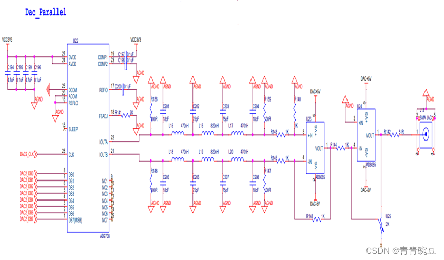 整个工程实现了用户通过对上位机PC端人机界面的操作,即可达到控制豌豆开发并行DAC输出给定频率和初始相位的正弦波、三角波、方波、梯形波的效果,上位机通信接口同时支持USB2.0、串口RS232和千兆网口LAN,但是同一时刻只能选择一种接口与开发板通信,为此笔者专门用Labview搭建了上位机人机界面环境并压缩成安装包,大家直接解压安装到PC端即可,上位机的具体操作将在后面详细介绍,如图1所示是豌豆开发板Artix7上并行DAC的电路。
