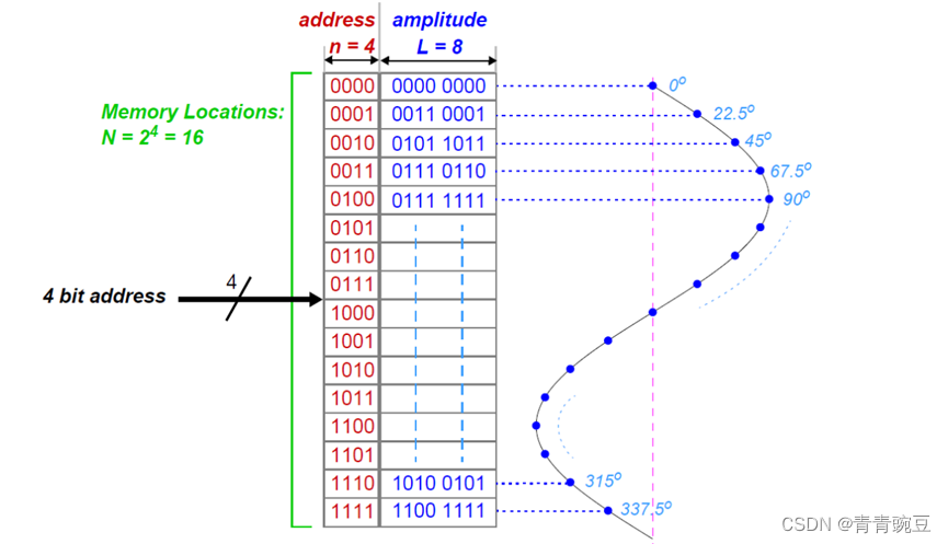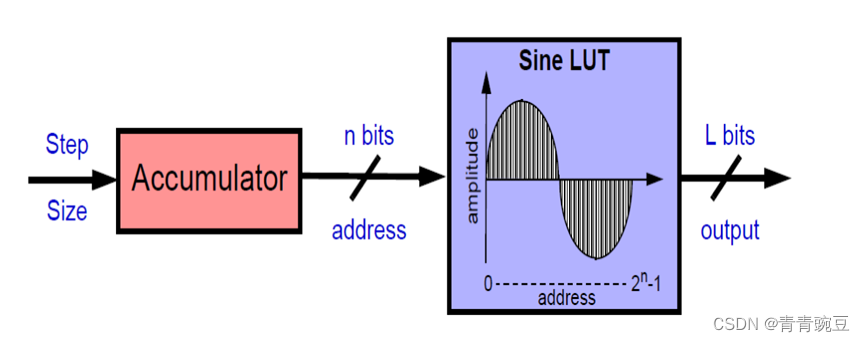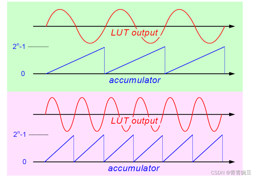 开门见山地对于数字变频包含了三个核心的知识点即1. 累加器步长;2. 地址间映射;3. 频率分辨率,搞明白这些对于后面理解DDS IP核的配置和任意波的实现起到重要作用,所以请大家花些时间去认真思考,如图5、图6、图7所示是数字变频的示意图,可以说这三幅示意图非常形象地把数字变频技术勾勒出来。