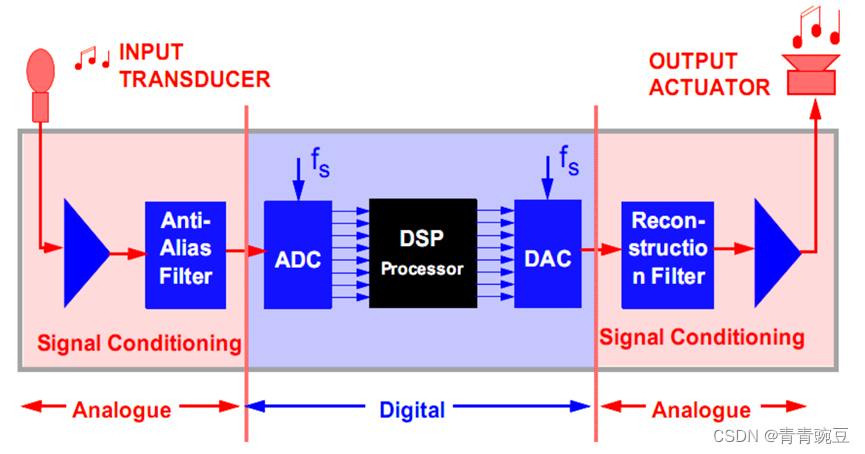 如图3所示是DSP处理器在数字信号处理中的应用示意图,即通过用ADC去采集目标信号再根据项目需求进行数字信号处理,这里涉及到采样与量化理论、离散傅里叶变化等知识在这里就不再展开了,当然实际项目当中对于ADC采集和DAC转换因为硬件上肯定存在误差还需要引入校准等操作,最后根据实际需求可能还需要通过DAC把数字信号处理的结果通过一个模拟量传输出去,大家可以看到整个DSP处理器一直工作“数字区域”对数字信号进行处理再通过ADC或者DAC实现对“模拟区域”的控制,这也是数字信号处理中一个非常经典的模型。