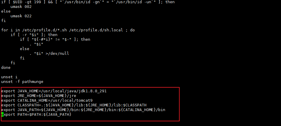 export JAVA_HOME=/usr/local/java/jdk1.8 export JRE_HOME=${JAVA_HOME}/jre export CLASSPATH=.:${JAVA_HOME}/lib:${JRE_HOME}/lib export PATH=${JAVA_HOME}/bin:${PATH}