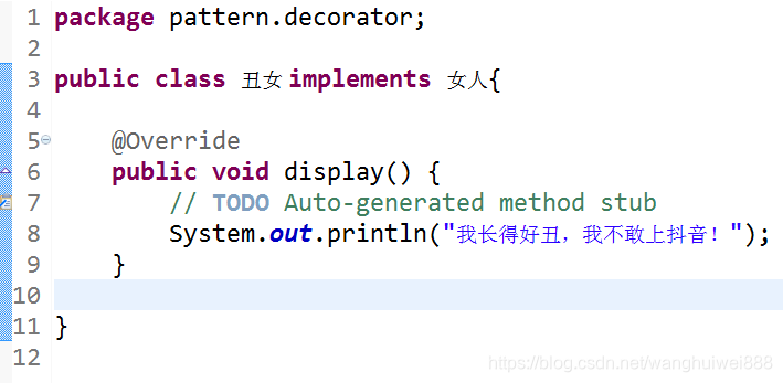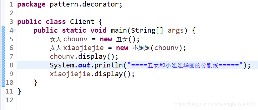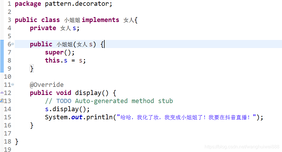 注:装饰器模式是为了增强原有类的功能,所以这里我们的小姐姐持有一个丑女的对象,这样就可以调用丑女的功能了