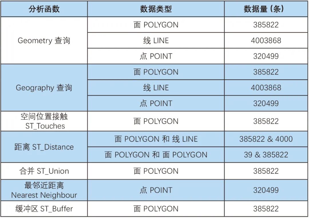 根据对多个行业的重点空间应用系统的调查,我们选取了如下这些在应用中使用频率较高的空间运算函数进行模拟测试,测试的数据量如下表所示: