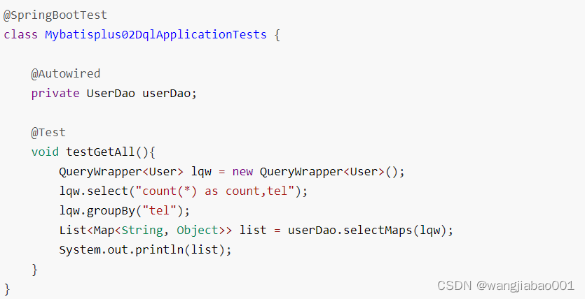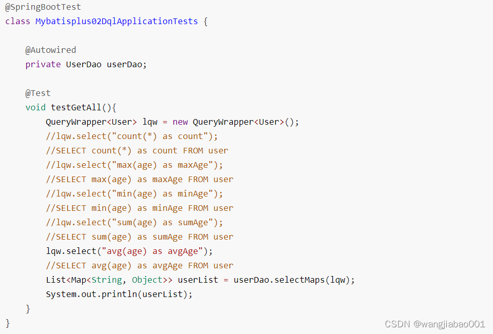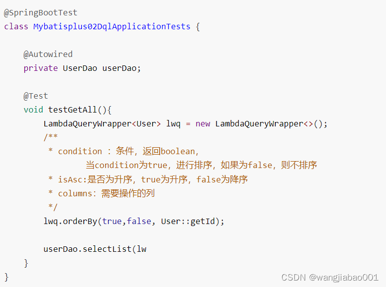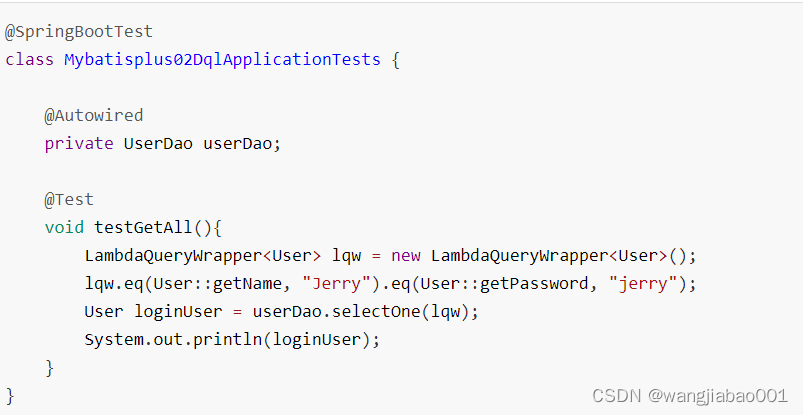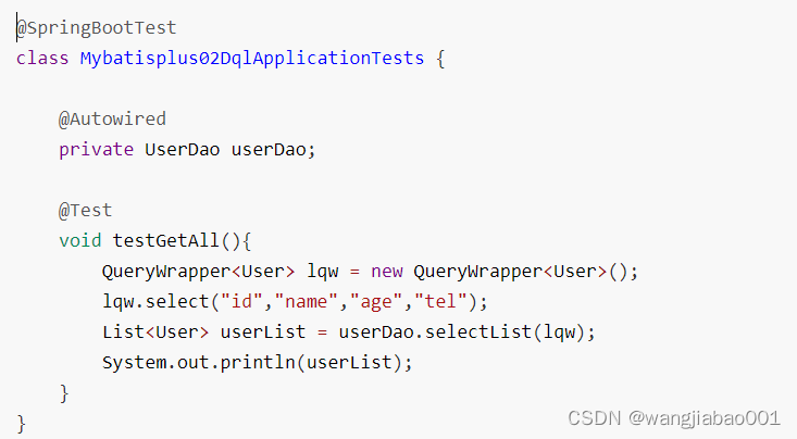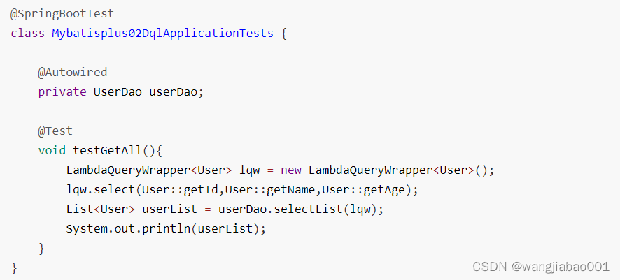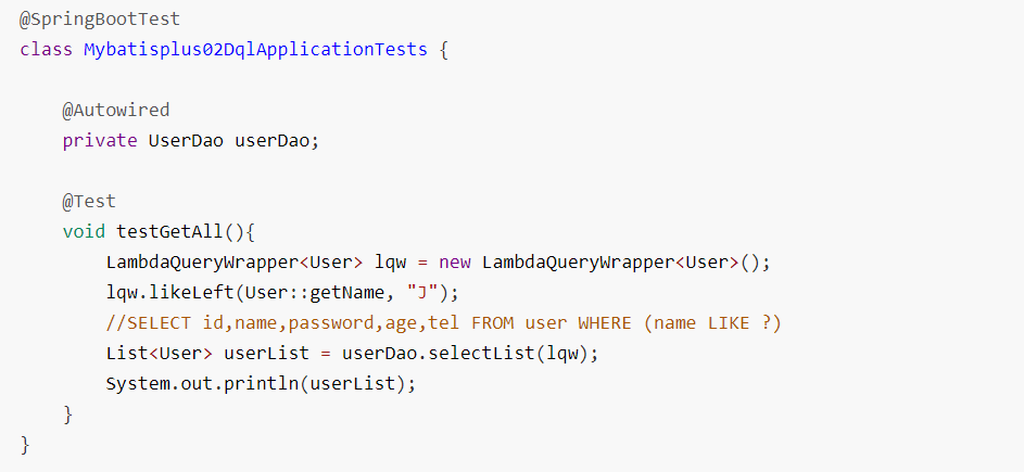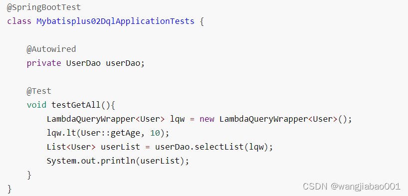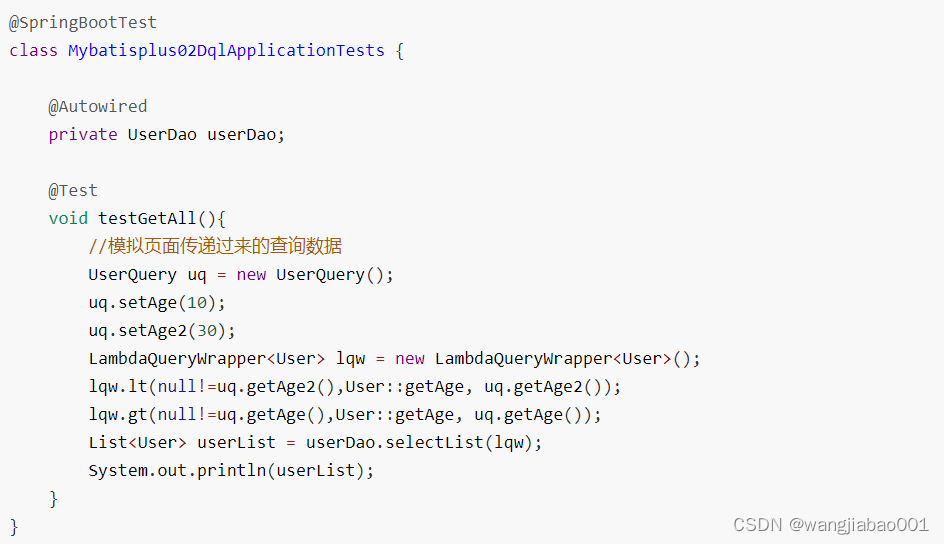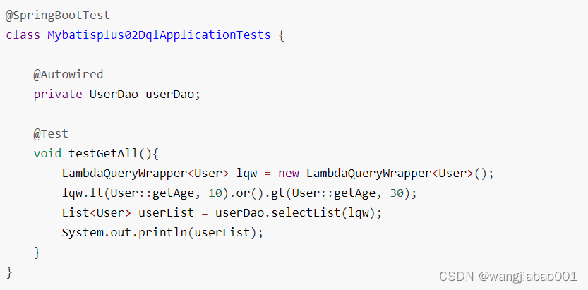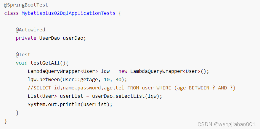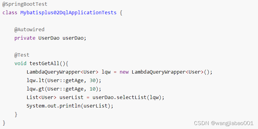 LambdaQueryWrapper<User> lqw = new LambdaQueryWrapper<User>(); lqw.lt(User::getAge, 30).gt(User::getAge, 10); List<User> userList = userDao.selectList(lqw); System.out.println(userList);