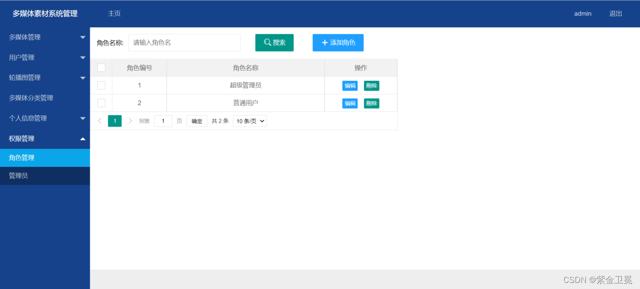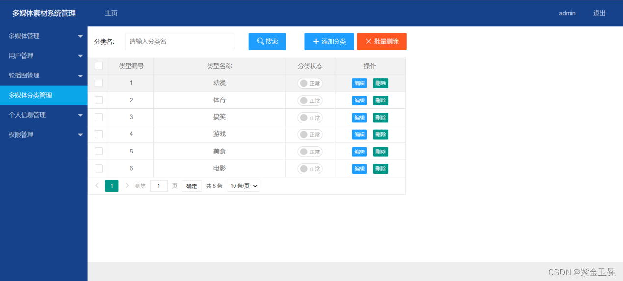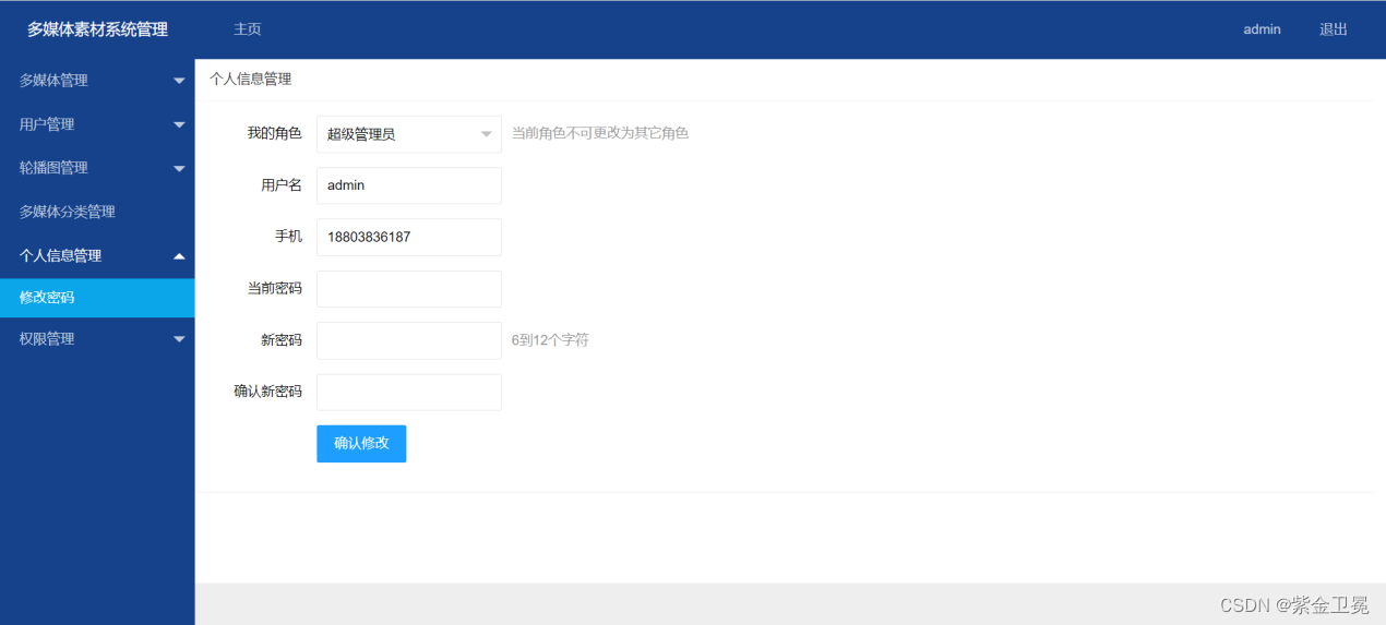 管理端登陆后,会根据权限来显示不同菜单和操作权限,若非超级管理员,只能看到自己上传的多媒体素材,管理员可以看到所有的多媒体素材。管理端有多媒体管理、用户管理、轮播图管理、多媒体分类管理、个人信息管理、权限管理六大模块。