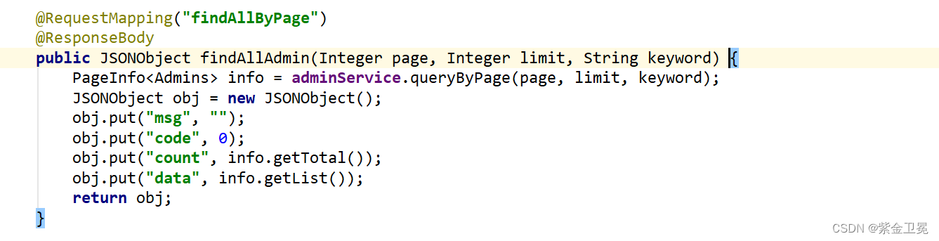 这是管理员查询对应的方法。前端把分页信息和搜索条件传过来,进行查询,然后把查询结果以JSON的形式返回到前端。