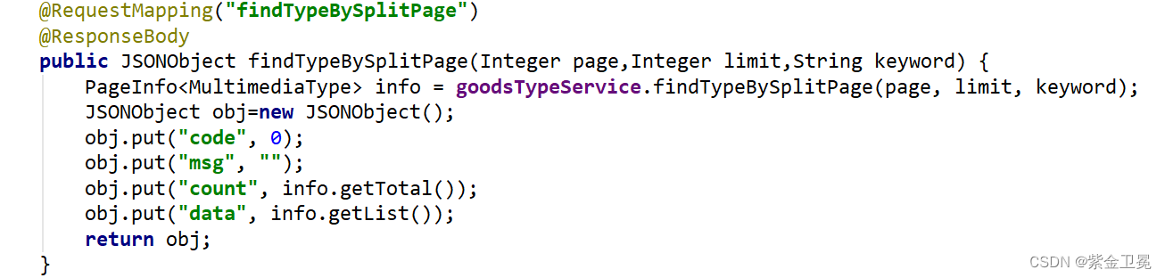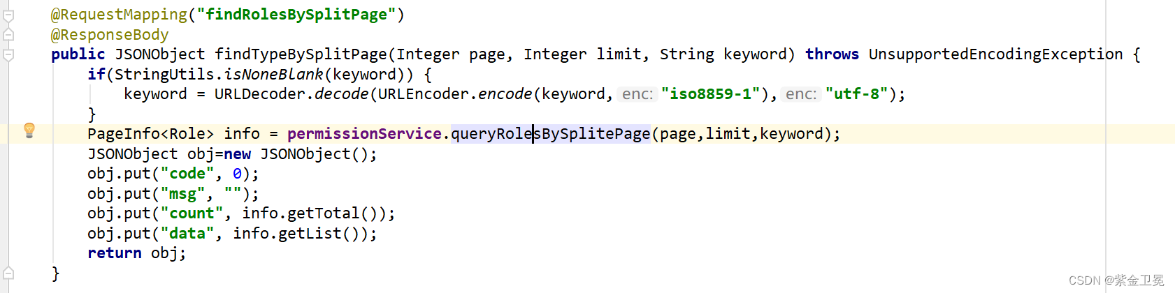 这是角色查询对应的方法。前端把分页信息和搜索条件传过来,进行查询,然后把查询结果以JSON的形式返回到前端。
