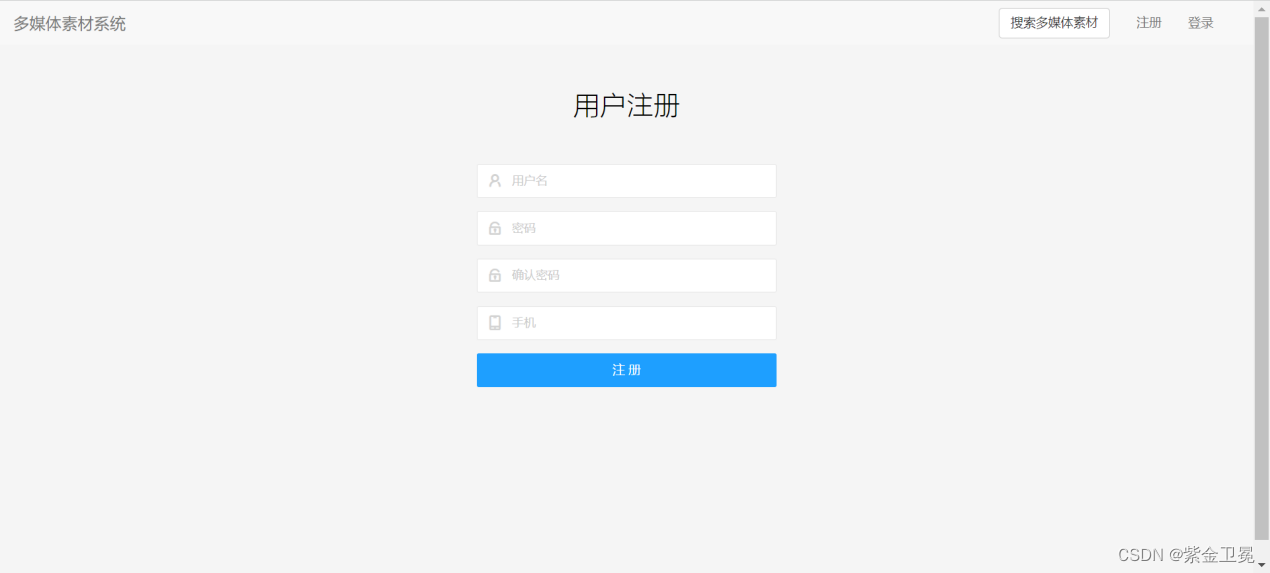 点击注册按钮,跳转到注册界面,输入用户名、密码、确认密码和手机号,点击注册功能,完成用户注册。前端用户注册时,会自动在管理端注册一个用户名、密码、手机号相同的管理端用户,以便用户上传素材。