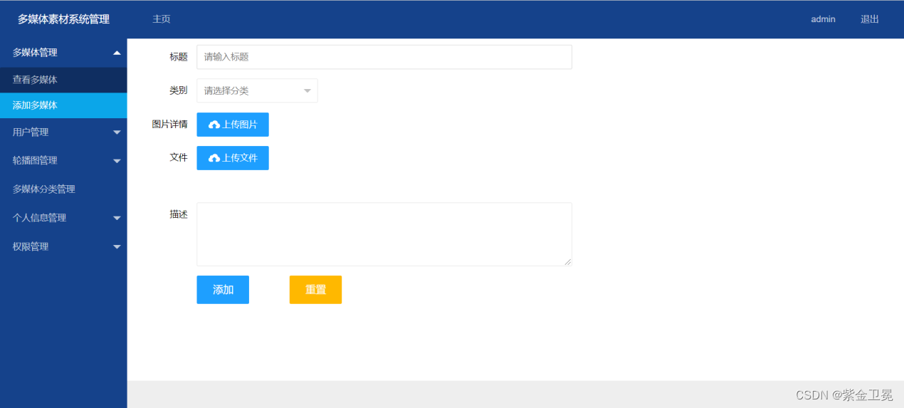 B.多媒体管理:上传多媒体文件,包括标题、类别,图片、描述。