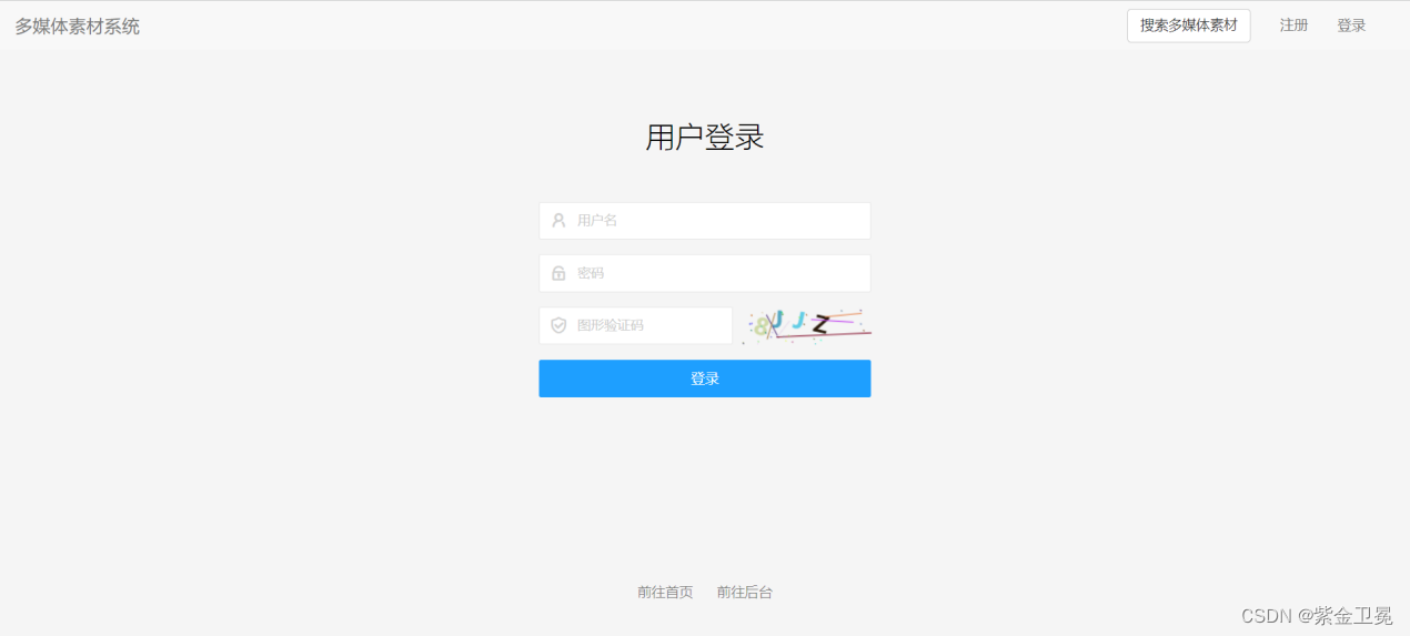 前端用户未登陆时,可以查看多媒体素材的详情图片,但是无法查看多媒体素材文件,只有登陆后才可以查看具体的文件以及对多媒体素材进行评论。当前端用户注册时,同时也会在管理端注册。利用前端注册的用户名和密码可以登陆管理端,进行多媒体素材的上传、查看、编辑、删除操作。