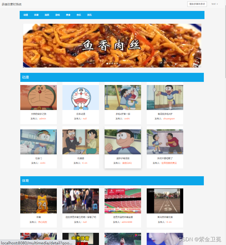 用户进入网站之后,在首页可以看到多媒体素材分类,以及每个分类下的多媒体素材。