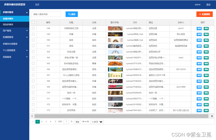 多媒体管理分为查看多媒体和添加多媒体。查看多媒体页面是对多媒体素材的查询、搜索、编辑和删除,添加多媒体则是上传多媒体素材。每个管理员都可以看到自己上传的多媒体素材,超级管理员可以看到所有人上传的多媒体素材。