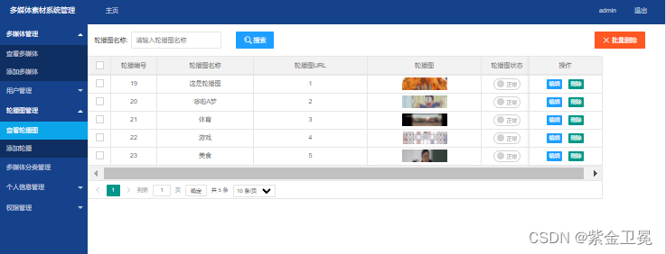 D.轮播图管理:分为轮播图查询和添加两个菜单,查询页面可以对轮播图进行查询、编辑和删除;添加页面可以添加轮播图。