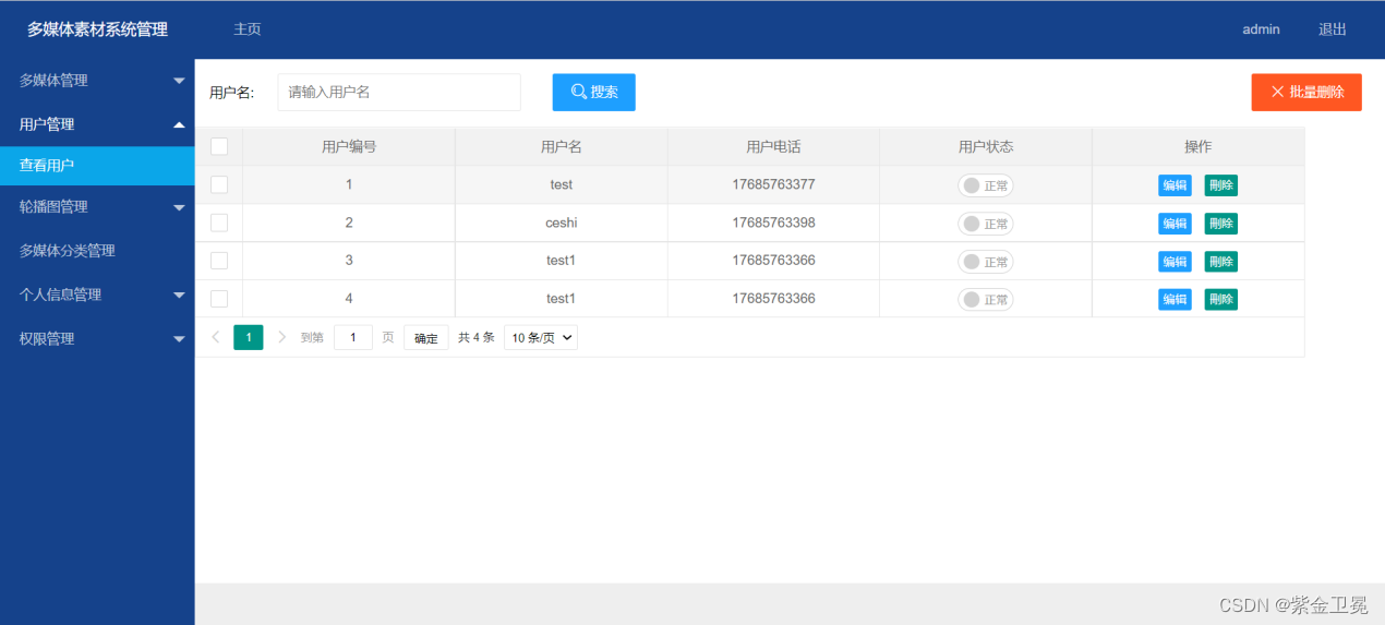 用户管理是对前端用户进行管理的菜单,可以进行查询、搜索、编辑、删除和禁用,还可以进行批量删除。