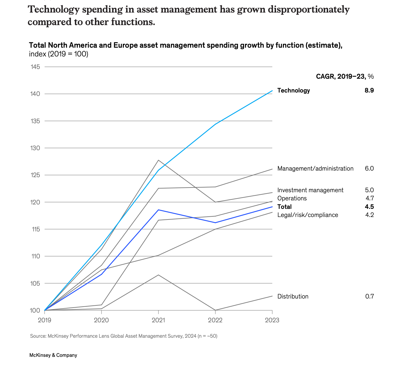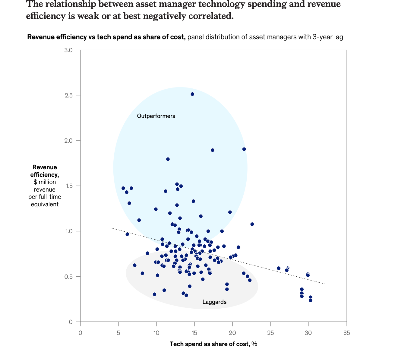 技术支出是罪魁祸首:2019-2023年,北美和欧洲技术投资 CAGR (复合年增长率)达8.9%,远高于其他职能。但这些支出未转化为生产力提升。报告分析显示,技术支出占比与成本/ AUM 比率无强相关(R²仅 1.3%),收入效率也弱相关或负相关。原因在于,60-80% 预算用于维护旧系统,仅 20-40% 用于变革,且变革中仅 5-10% 用于全公司数字化转型。