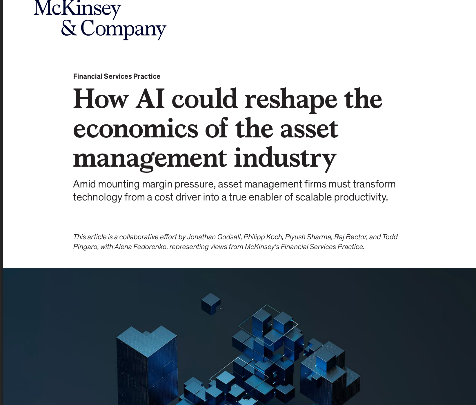在资产管理行业面临利润压缩的当下,技术正从成本负担转为生产力引擎。麦肯锡金融服务实践团队于2025年7月发布的报告《 人工智能将如何重塑资产管理行业的经济 》深入探讨了这一转变。