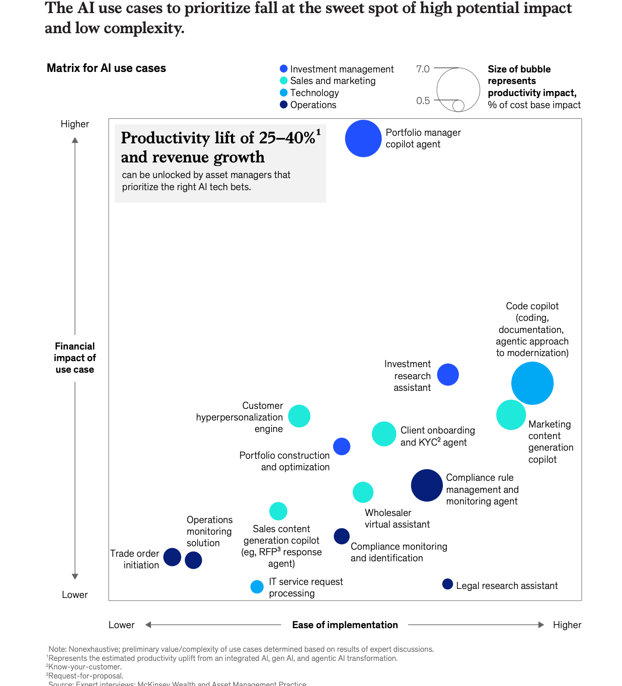 报告乐观地指出, AI 是突破口,能重塑行业经济。通过端到端工作流再造,中型资产管理者(5000亿美元 AUM )可节省25-40%成本。早期价值体现在分销流改善、投资流程优化、合规自动化和软件开发加速。