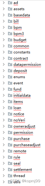 再来看这个bpm包(bpm3是对bpm的版本升级),该包下是与流程引擎相关的代码。这个包的存在就是典型的破环包命名原则的例子。流程引擎的根本目的是为业务功能提供支持,属于实现业务的手段,不属于业务概念范畴,所以这个包是不应该存在的,退一步来讲,即使存在也不应与 ad 和 bill 处于同等级别。好的选择是将bpm中的代码与调用它的代码融合在一起(从OO的角度说就是要隐藏实现手段),然后删除这个对体现业务没有任何帮助的包。