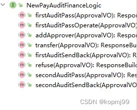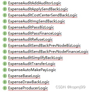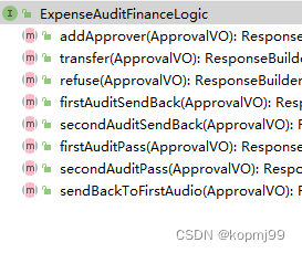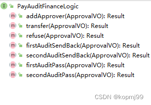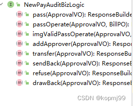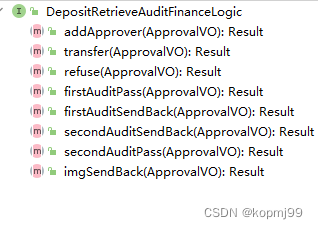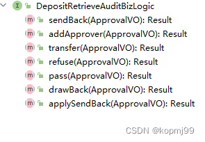 以上只列举了部分接口,这些接口负责不同类型单据的审批。可以看到,这些接口中都有撤回,批准,拒绝,退回,添加审批人和转交他人几个方法,个别的接口因为业务差异定义了自己特有的方法,并且以上接口的实现类中的代码也是大同小异。
