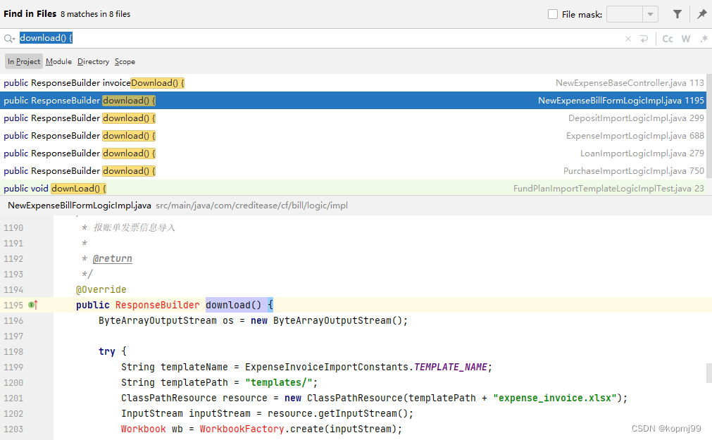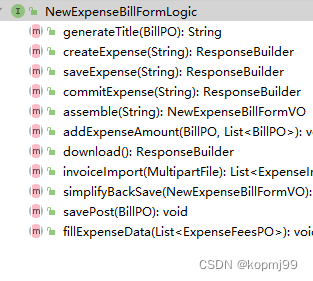 首先,重新定义一个接口——BillOperationService,可将create(),save(),commit(),以及approve(),reject(),sendBack(),addApprover(),transferTo()这几个与单据审批有关的方法全部放入该接口中,因为这些方法是所有类型单据所共有的操作。除以上方法外,还须再定义一个getBillTypeCode(),用于返回各类型单据的类型编码。剩下那些各类型单据所特有的方法则可视情况而定了,比如下图所示的download(),这些download()内部的代码几乎完全相同,显然这应该是一种能力,所以可以为这个能力创建一个Downloadable接口,并提供默认的实现代码,如此download()的调用者就无需依赖不必要的接口,从而也符合了ISP。