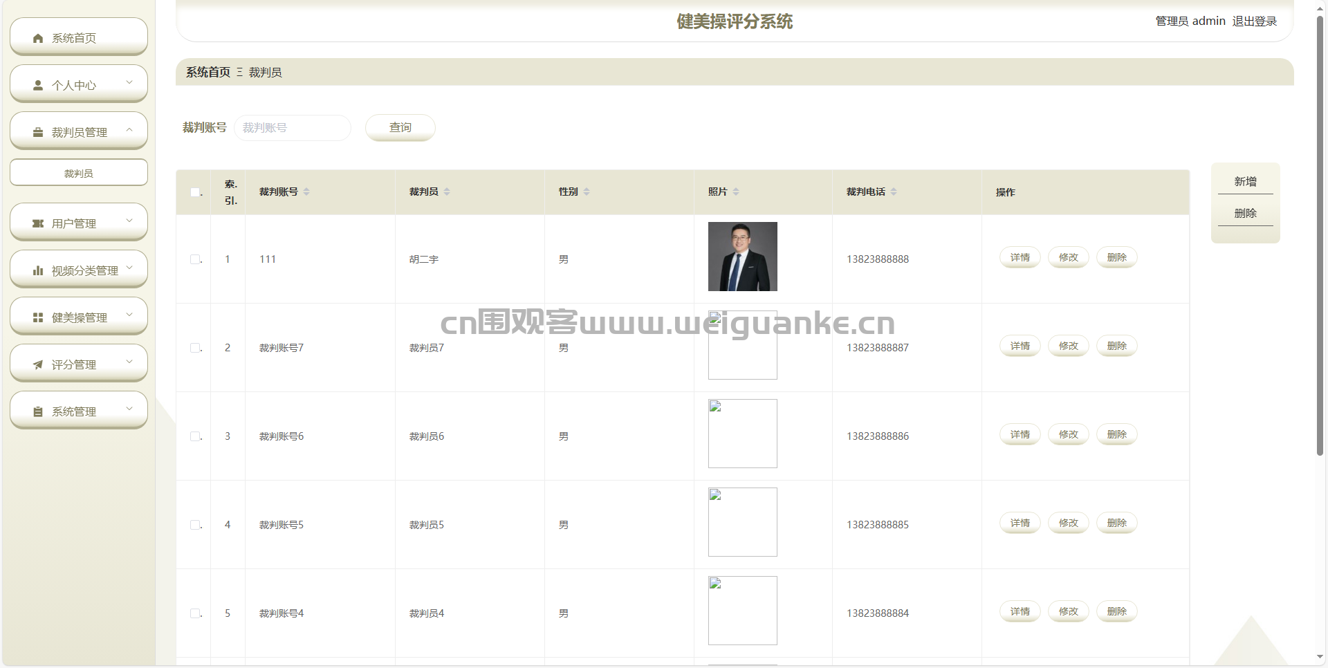 裁判员管理:用于管理系统中的裁判员信息,包括添加、编辑、删除裁判员,以及查看裁判员的评分记录等。