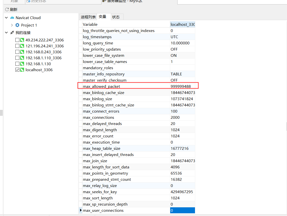 使用Navicat导入的时候出现[ERR]2006 路径:工具(T)->服务器监控->MySQL->变量->max_allowed_packet;//英文版:Tools->Server Monitor->MySQL->Variables->max_allowed_packet;