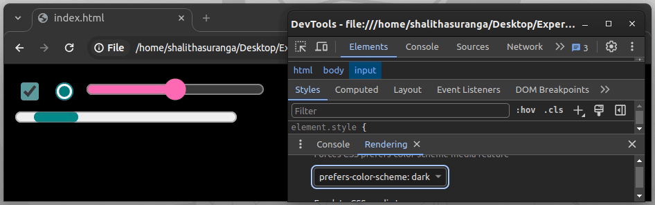 CSS 还提供了 color-scheme 属性,可与 accent-color 属性一起使用,以提高在明亮和暗黑的系统主题上的原生表单控制可见性: