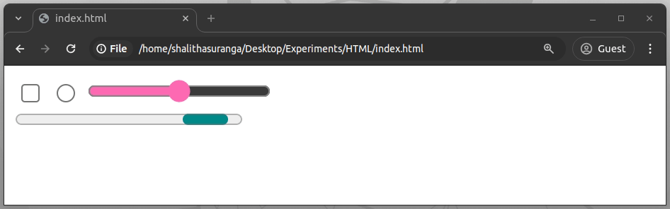 <input type="checkbox" style="accent-color: cadetblue"/> <input type="radio" style="accent-color: teal"/> <input type="range" style="accent-color: hotpink"/><br/> <progress style="accent-color: darkcyan"></progress>