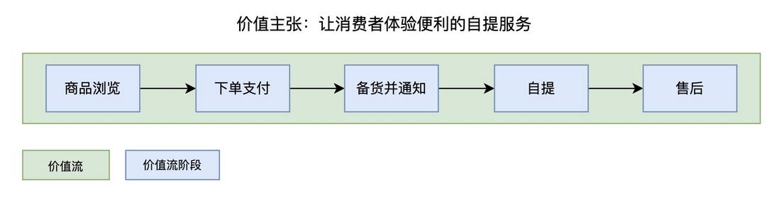 - 价值流阶段:整个价值链由5个阶段组成,分别为商品浏览、下单支付、备货并通知、自提、售后。