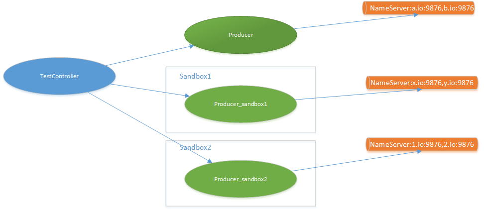 这里可以看到,producer 对象是直接 new 出来的 DefaultMQProducer,而 producer_sandbox1 和 producer_sandbox2 是通过不同的沙箱创建出来的;三个 client 分别连接到不同的 NameServer 中,同时其它属性保持一致。