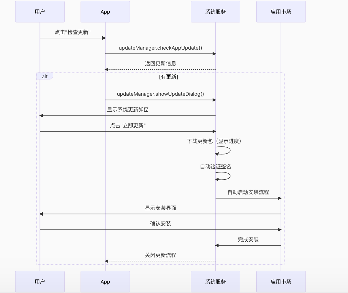 用户交互 | 跳转到应用市场 | 应用内完成所有流程 |