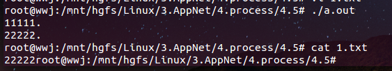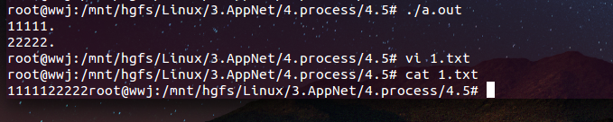 // 首先打开一个文件 int fd = -1; pid_t pid = -1; fd = open("1.txt", O_RDWR | O_TRUNC); if (fd < 0) { perror("open"); return -1; } // fork创建子进程 pid = fork(); if (pid > 0) { // 父进程中 printf("11111.\n"); write(fd, "11111", 5); sleep(1); } else if (pid == 0) { // 子进程 printf("22222.\n"); write(fd, "22222", 5); sleep(1); } else { perror("fork"); exit(-1); } close(fd);