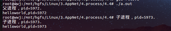 //在这里所做的操作,在父子进程都有这个操作 printf("helloworld,pid=%d\n",getpid()); return 0; return 0; } |