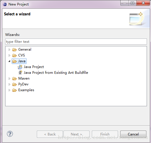 之所以会让我们选择某一种工程的创建向导,是因为Eclipse是一个开放的平台,在其中安装不同语言的插件就可以开发不同的项目,比如C、C++、Python,我在它里面安装了Python插件,见上图中的PyDev文件夹,如果我们想开发Python项目,就选择PyDev下的PyDev Project ,这里就直接说Java吧。