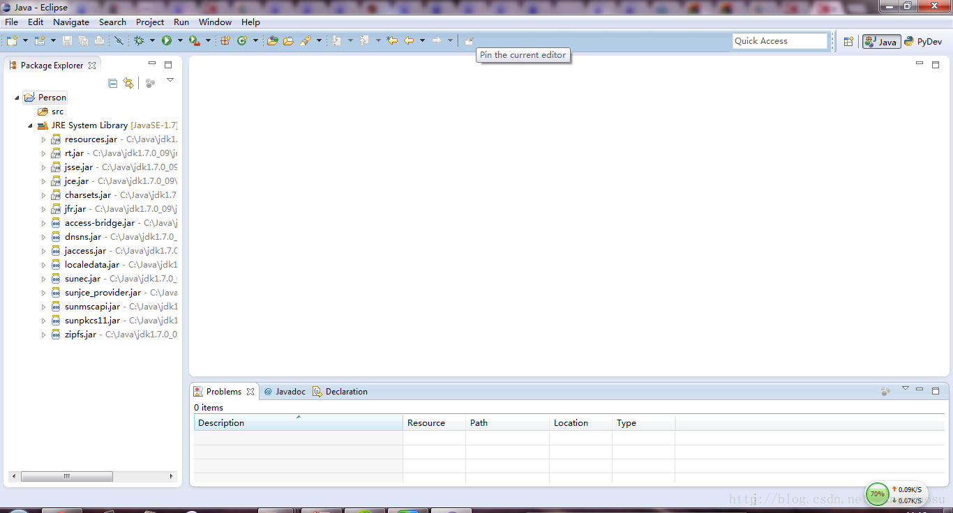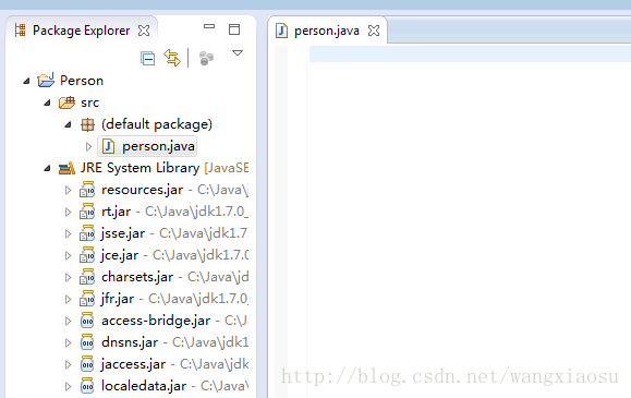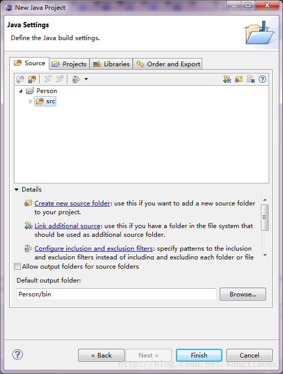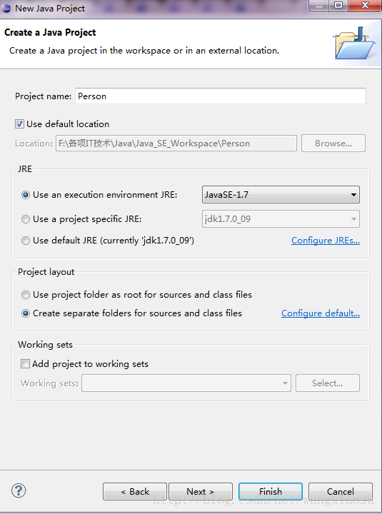 Location:就是这个项目的各个源代码文件,产生的过程文件,说明文档等等所放置的位置,默认是我们一开始时设置的workspace,eclipse会自己在该目录下创建一个文件 夹Person,将该项目产生的文件都放在该目录中;