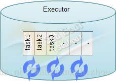 为确保整个web服务器的性能,应该在接到请求后以最快的速度转交到其他线程上去处理。在接收到客户端的请求后tomcat将对这些请求交给任务执行器Executor,它是一个拥有最大最小线程数限制的线程池,之所以称之为“任务执行器”是因为线程池可以看做是启动了若干线程不断检测某个任务队列,一旦发现有需要执行的任务则执行。如下图,每条线程都不断循环检测任务队列,数量不会少于最小线程数也不能大于最大线程数。
